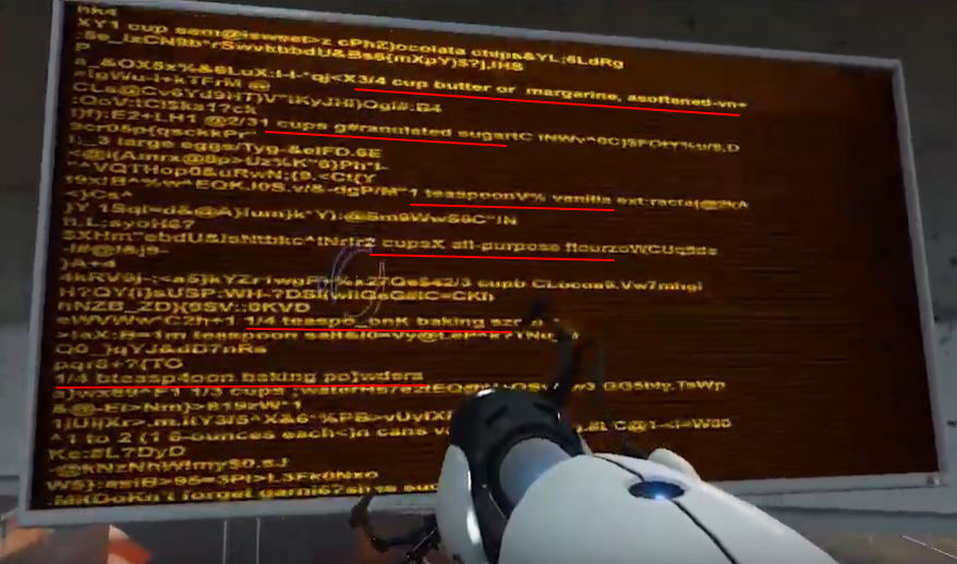 You’ll come across a few large computer screens during the escape portion of the game. The screens have a lot of corrupted code and what looks like gibberish quickly scrolling up, but if you look closely, you can see ingredients to the cake!